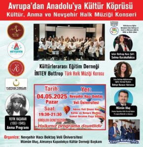 Avrupa’dan Anadolu’ya Kültür Köprüsü kültür, sanat, anma ve müzik şölenlerine davetlisiniz Almanya Kapadokya Kültür Derneği Başkanı Mümün Uluç, uzun yıllardır Avrupa’da Kapadokya bölgesinin tanıtımını ve kültürel etkinliklerini başarıyla organize ediyor…