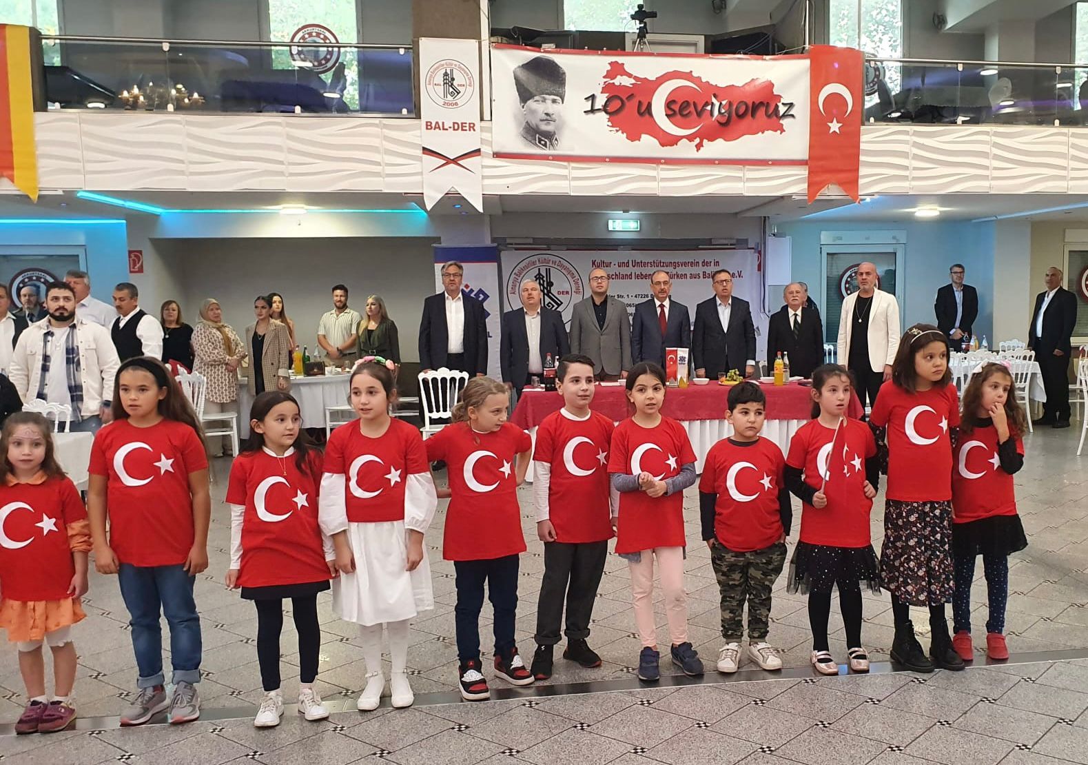 Türk ve Alman bayraklarının yanı sıra “Bu Şehir Bizim, Balıkesirspor Hepimizin”, “Hayat 10’la Güzel”, “Kırmızı Beyaz Sensiz Olmaz”, “Bu Kalp Sana Esir Tek Sevda Balıkesir”, “10’u Seviyoruz” pankartlarının asıldığı Akkurt Düğün Salonu’ndaki program Türkiye ve Almanya ulusal marşlarının okunmasıyla başladı. Türk bayrağı tişörtleriyle salona giren minikler de etkinliğe renk kattı.