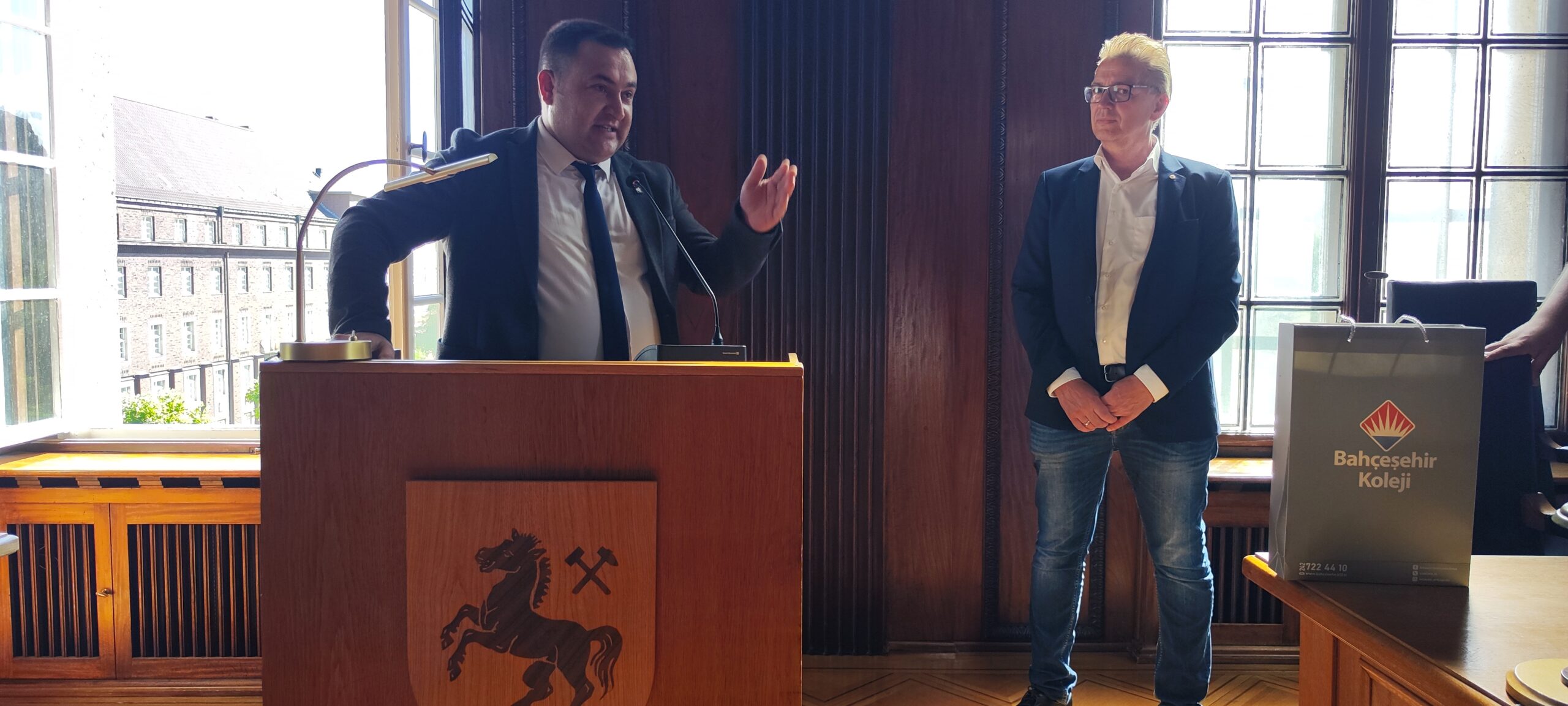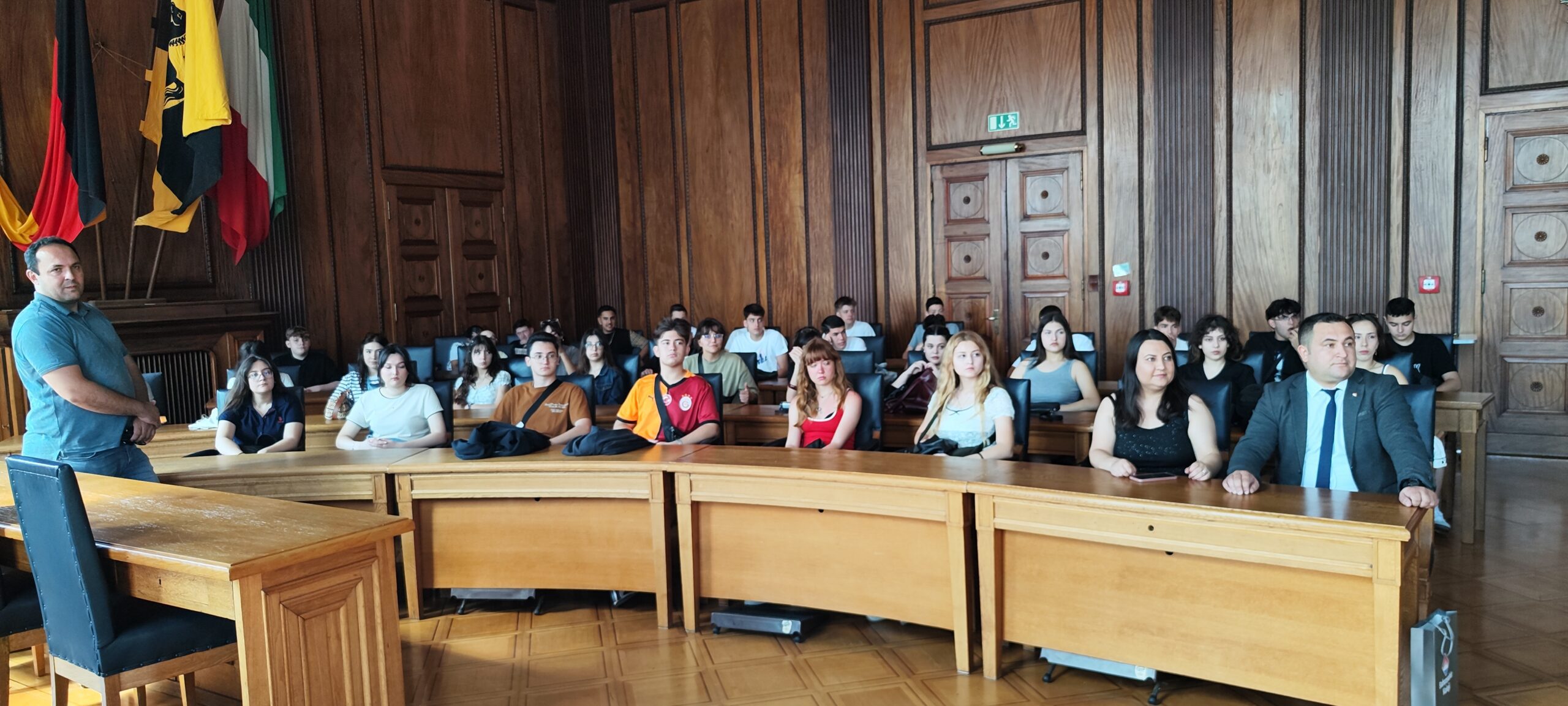 Ziyaret sırasında yaptığı konuşmada Başkan Yardımcısı Gera, “Başkanımız Dr. Frank Dudda adına sizleri selamlıyorum. Bu tarihi binada sizleri ağırlamaktan büyük mutluluk duyuyorum. Proje kapsamında şehrimizi, eğitim sistemimizi ve kardeş okulunuzu yakından tanıma fırsatı bulacaksınız. Bu tür projelerin arkasında büyük bir özveriyle çalışan öğretmenlerimize teşekkür ediyorum. Hepinize Herne’de ve Almanya’da keyifli ve verimli bir zaman geçirmenizi diliyorum,” ifadelerini kullandı. Gera, konuşmasında Herne kenti ve Belediye binası hakkında heyeti bilgilendirdi.