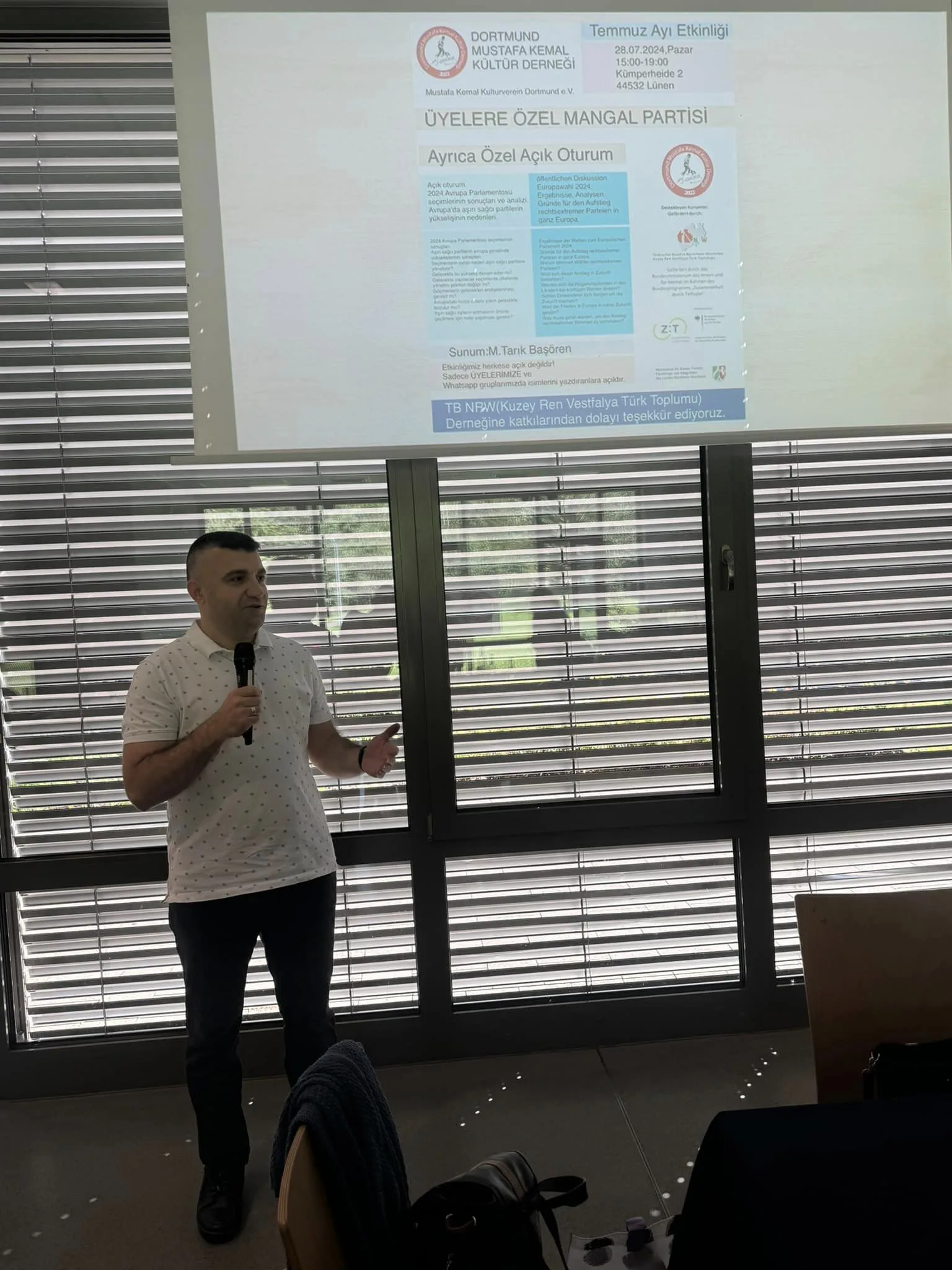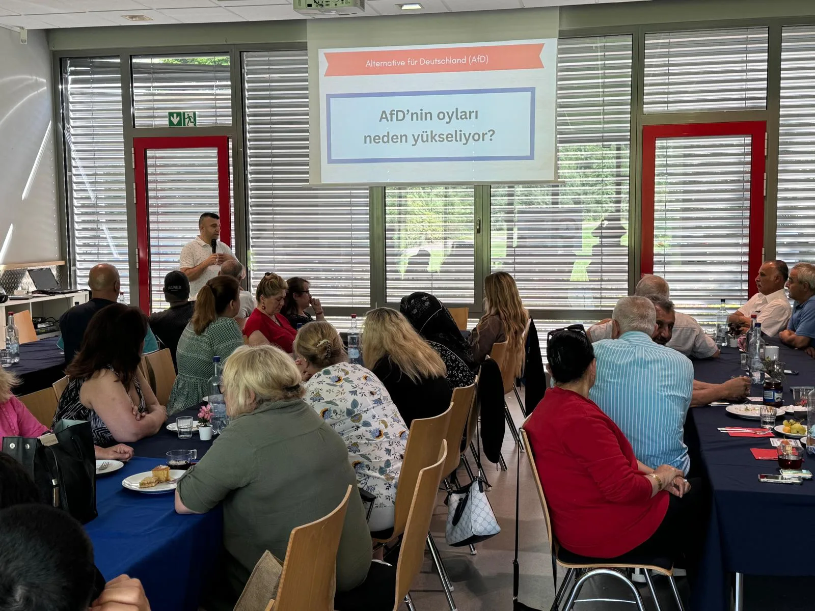 Lünen Gahmen Bürgerzentrum’da düzenlenen ve TB NRW Türk Toplumu Derneği tarafından desteklenen etkinlik Başkan Erkan Temizkanoğlu’nun yaptığı açılış konuşması ile başladı. Ardından öğretmen M.Tarık Başören’in “2024 Avrupa Parlamentosu Seçim Sonuçları ve Analizi” başlıklı sunumunu gerçekleştirdi. Başören, partilerin seçim sonuçlarını ve kazandıkları milletvekili sayılarını aktardıktan sonra özellikle aşırı sağ partilerin Almanya’da olduğu gibi Avrupa’da yükselişe geçtiğini aktardı. Katılımcılara bu konu hakkındaki yorumlarını soran Başören, ardından yaptığı açıklamasında, “Ülkedeki yabancı nüfusunun artması, işsizliğin artması, Alman nüfusunun gelecekte azalacağı endişesi, koalisyon hükümetinin hataları/eksiklikleri ve göçmenlerin yaptığı yanlışlar” gibi etkenlerin aşırı sağ partilerin oy oranlarını artırdığını söyledi. Sunumun ardından katılımcılara mangal ziyafeti verildi.
