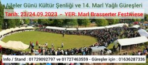 MARL-IGMG Marl Şubesi tarafından organize edilen “Aileler Günü, Kültür Şenliği ve 14. Marl Yağlı Güreşleri”, 23-24 Eylül 2023 tarihlerinde Marl Brasserter Festwiese’de yapılacak. Yöresel ve sosyal derneklerin de standlarını açabileceği etkinliklerde aileler ve çocuklar için etkinliklerin yanı sıra 14. Marl Yağlı Güreşleri de yapılacak.