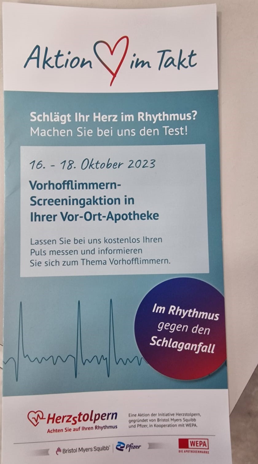 Lange Str. 26, 44532 Lünen adresinde faaliyet gösteren Adler Apotheke, ücretsiz kalp ritim bozukluğu testi yapıyor. LÜNEN- Son zamanlarda görülen şikayetlerin başında ritim bozuklukğu geliyor. 1690 yılında açılan ve Basma..