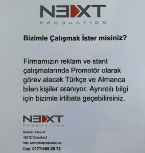 Almanya’nın farklı şehirlerinde telekomünikasyon sektöründe (hazır kart) reklam ve tanıtım çalışmaları yapacak takım arkadaşları aranmaktadır. Çalışma yapılacak şehirler şunlardır: Berlin, Hamburg, München, Nürnberg, Köln, Dortmund, Duisburg, Düsseldorf, Ulm ve Heilbron…